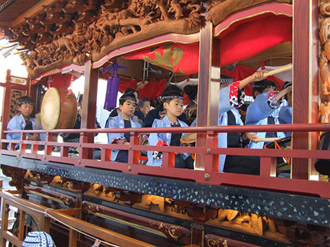 着飾った子供たちが御殿屋台の中で演奏をしていますが、その姿はとても可愛らしいものです。